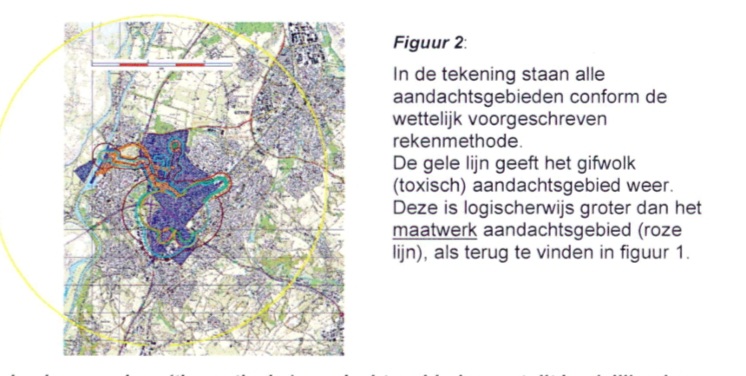 Met andere woorden het theoretische gifwolkaandachtsgebied (gele contour) is